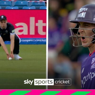 Northern Superchargers’ Harry Brook is dismissed after a catch by Manchester Originals’ Scott Currie, but the Headingley crowd were convinced