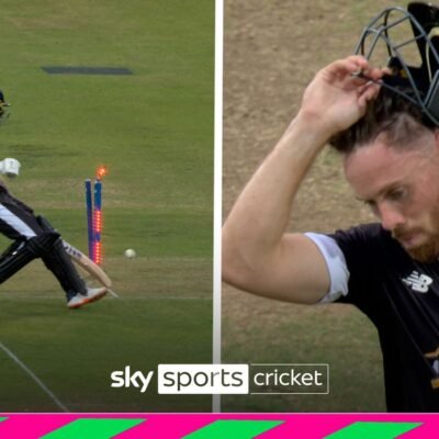 Manchester Originals’ Phil Salt is run out by the Northern Superchargers’ Adil Rashid after forgetting to ground his bat. Source