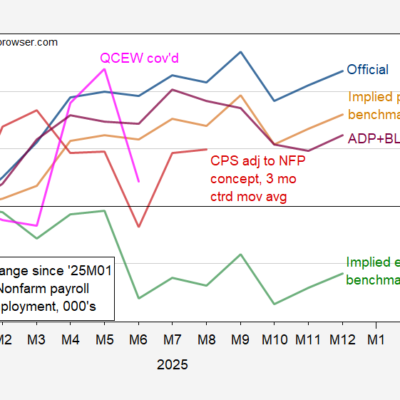 From CES, CPS, QCEW, Philly Fed, and from ADP: Figure 1: Cumulative change in nonfarm payroll employment from BLS CES-official