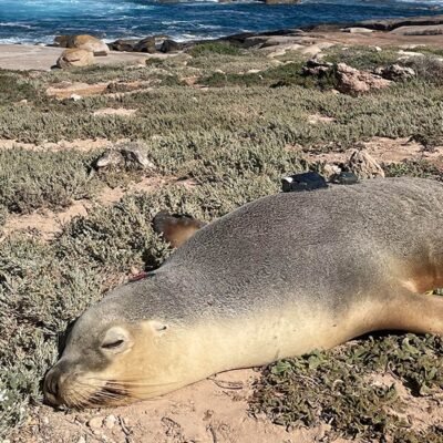 Scientists attached cameras and sensors to small pieces of neoprene that they glued to the sea lions’ backs.Credit: Nathan Angelakis
