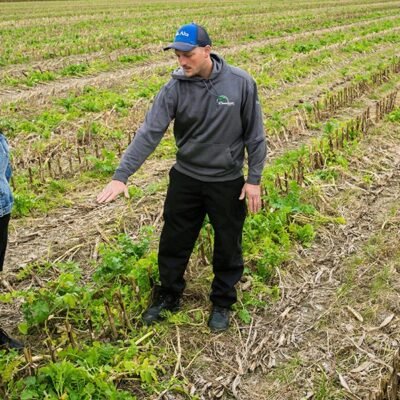 Agronomists examine a field where the cash crop, maize, has been harvested and a cover crop, radishes, has been planted