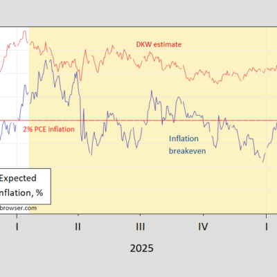 Up 0.26 ppts since the war’s beginning. Using Treasury and TIPS: Figure 1: 5 year Treasury-TIPS spread (blue), expected 5